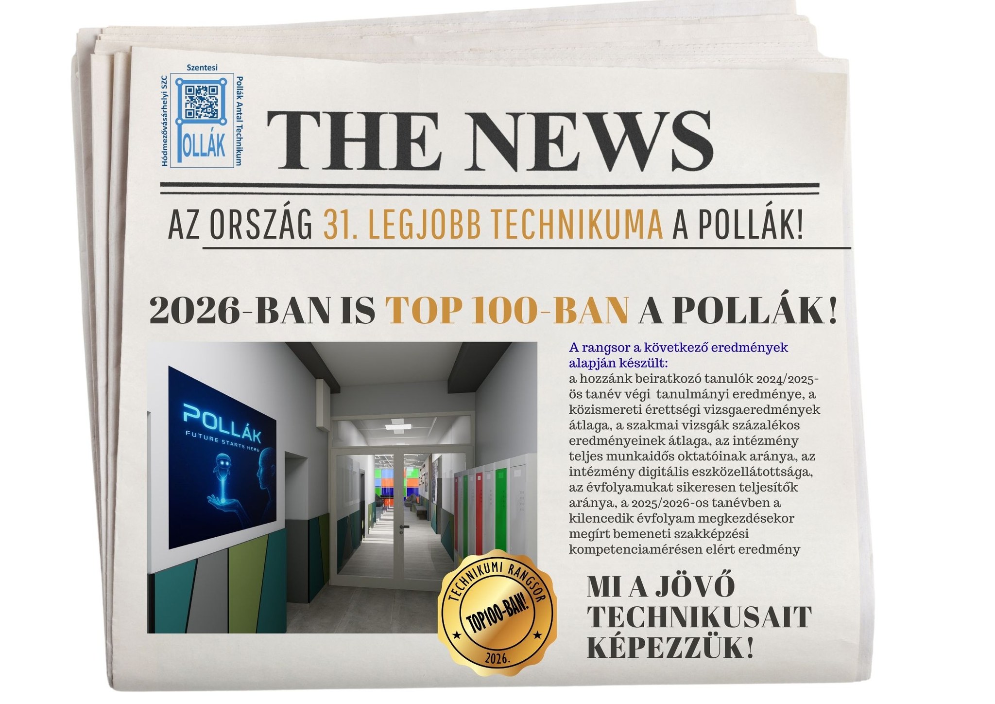 A Hódmezővásárhelyi Szakképző Centrum Szentesi Pollák Antal Technikuma ismét felkerült a technikumok TOP 100-as listájára, és ezúttal a kiváló 31. helyezést érte el. Ezzel a Csongrád-Csanád megyei technikumok rangsorában a 2. helyen végzett a Pollák, és a vidéki kistelepülésen található technikumok közül is csupán ketten előzik meg. Az idei rangsor részben megújult módszertan alapján készült, […]