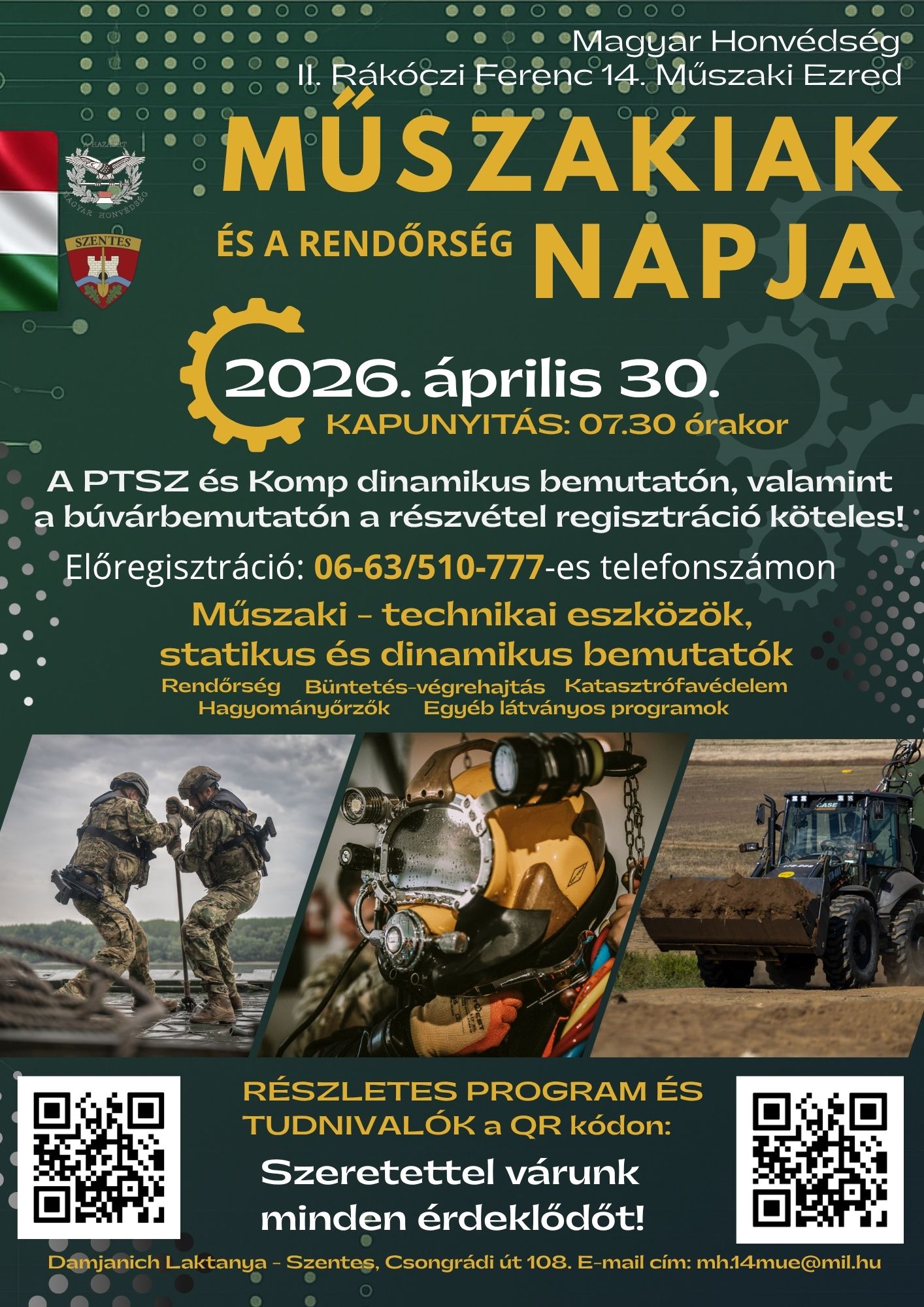 Április 30-án, csütörtökön reggel fél 8-kor kinyílik a műszaki ezred kapuja, ahol felvonul a teljes arzenál, és látványos bemutatókkal, szórakoztató programokkal várja az érdeklődőket a honvédség és a rendőrség. Forrás