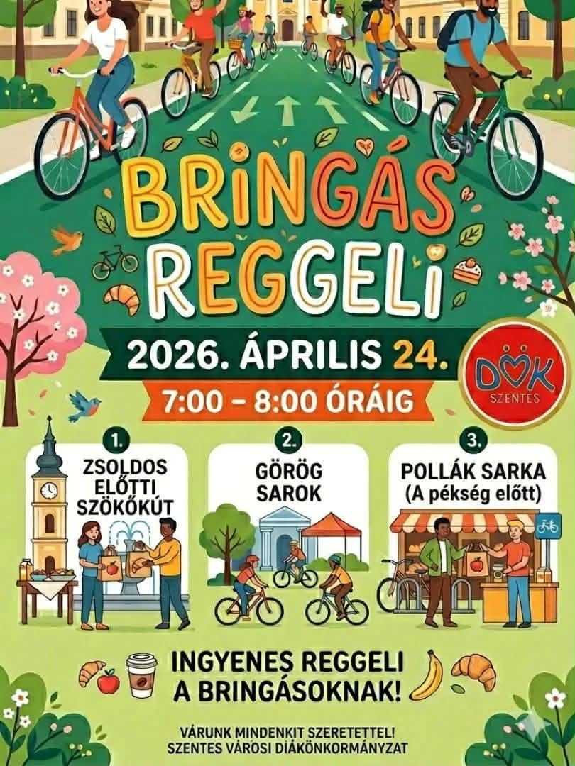 Szeretettel várunk mindenkit április 24-én, pénteken reggel 7–8 óra között egy vidám, közös BRINGÁS REGGELIRE! 🌞 📍 Több helyszínen is találkozhattok velünk: – Zsoldos előtti szökőkút – Görög sarok – Pollák sarka (a pékség előtt) 🥐 Fontos: finom reggelivel a biciklivel érkezőket tudjuk megvendégelni! Gyere, pattanj nyeregbe, és indítsd velünk a napot! Szentesi Városi Diákönkormányzat […]