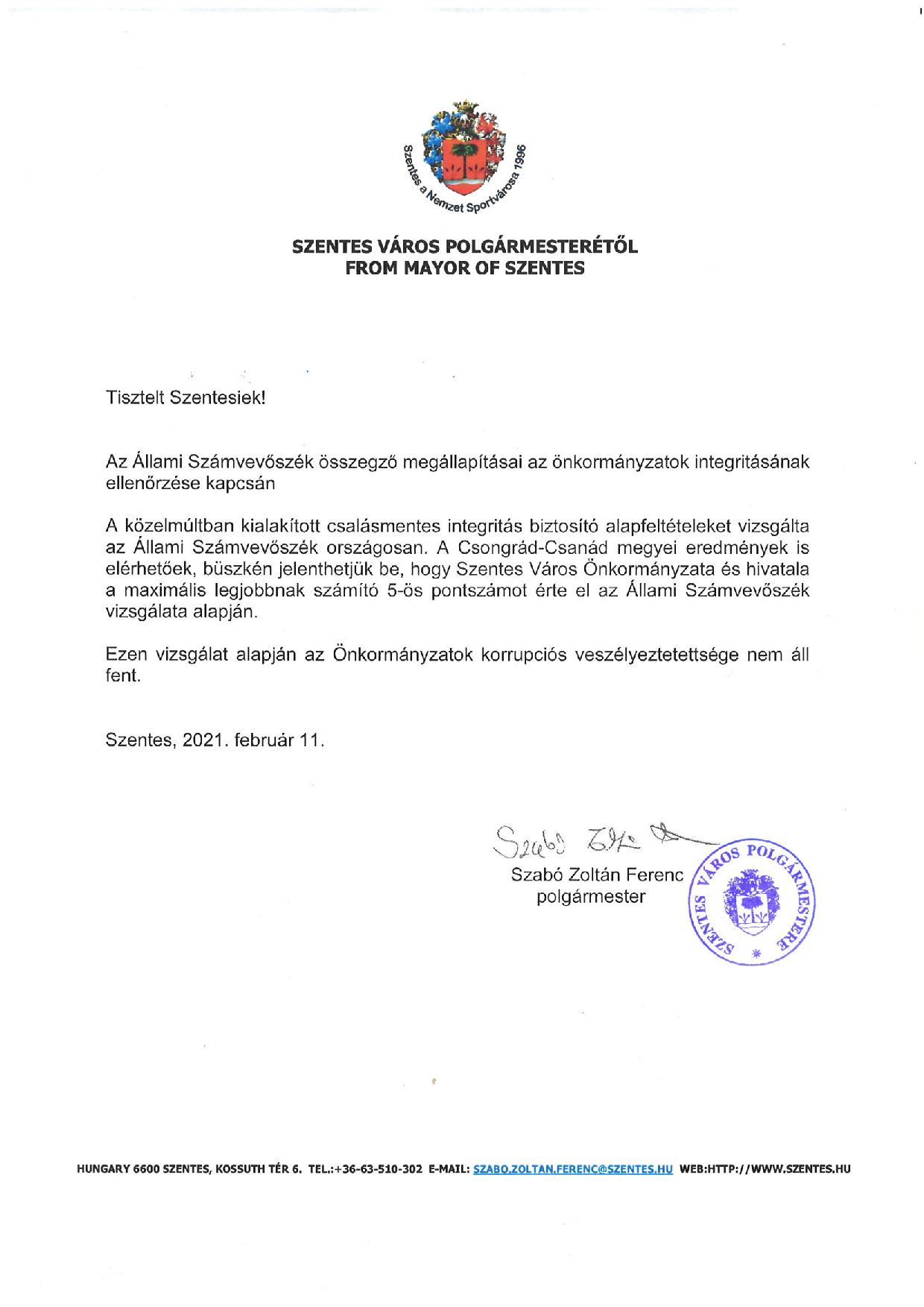 Nem áll fenn az önkormányzatok korrupciós veszélyeztetettsége, Szentes Város Önkormányzata és hivatala a maximális 5-ös pontszámot érte el az Állami Számvevőszék Vizsgálata alapján.