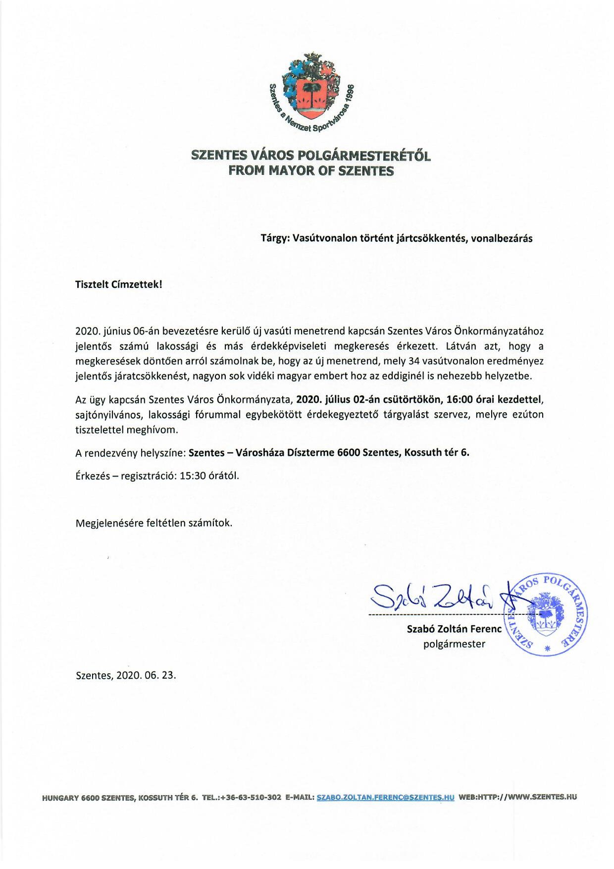 Lakossági fórummal egybekötött érdekegyeztető tárgyalásra várja az érdeklődőket Szabó Zoltán Ferenc polgármester július 2-án, csütörtökön 16 órától a városháza dísztermébe. A téma a vasúti járatcsökkentés