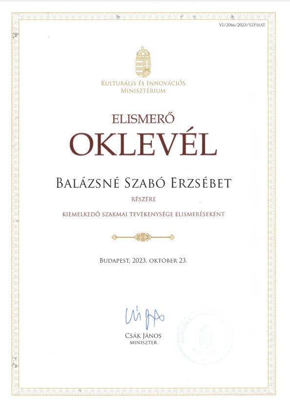 Kiemelkedő szakmai tevékenységéért Miniszteri Elismerő Oklevelet vehetett át a közelmúltban Balázsné Szabó Erzsébet, a