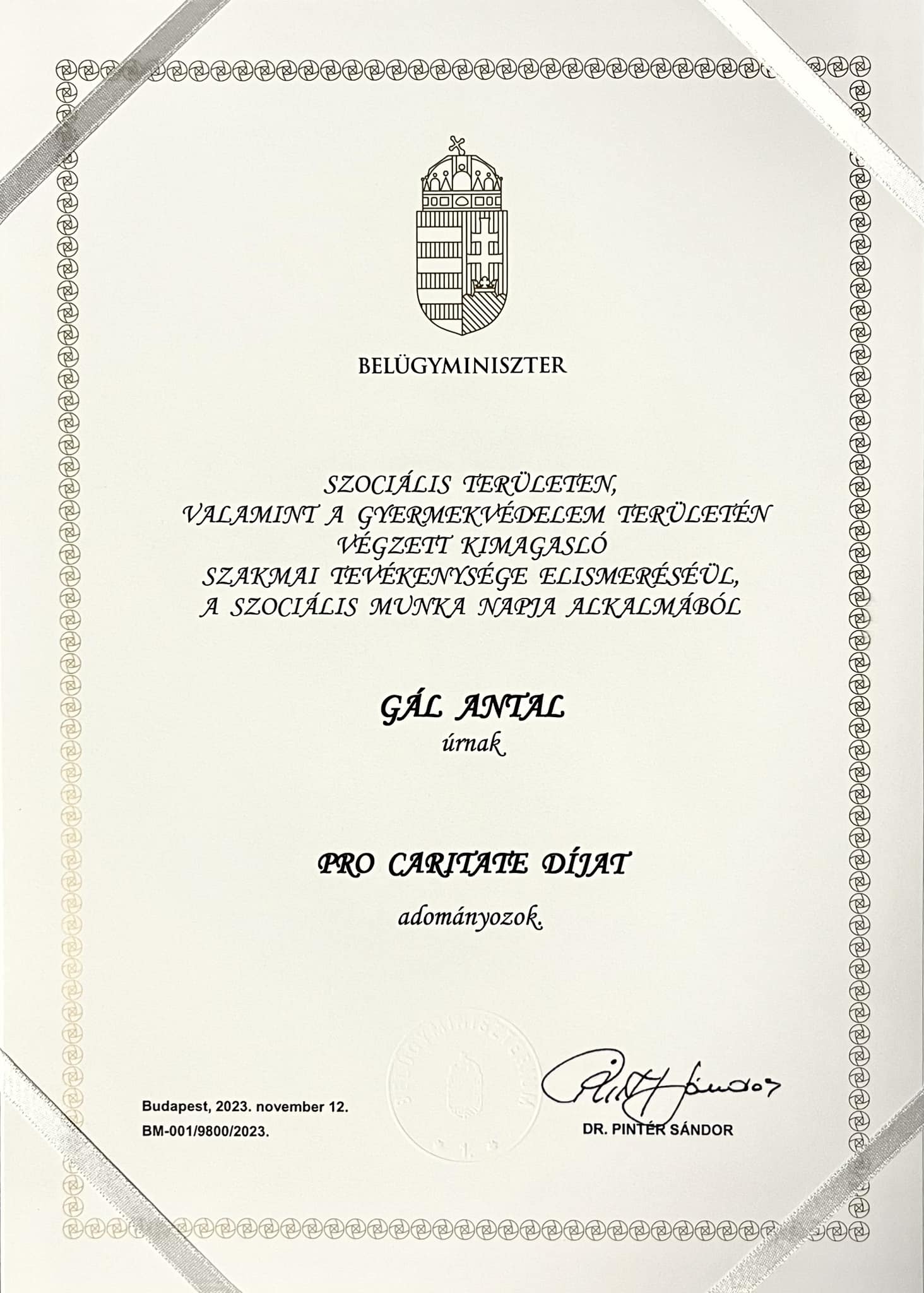 A szociális területen, valamint a gyermekvédelem területén végzett kimagasló szakmai tevékenysége elismeréséül dr. Pintér Sándor belügyminiszter