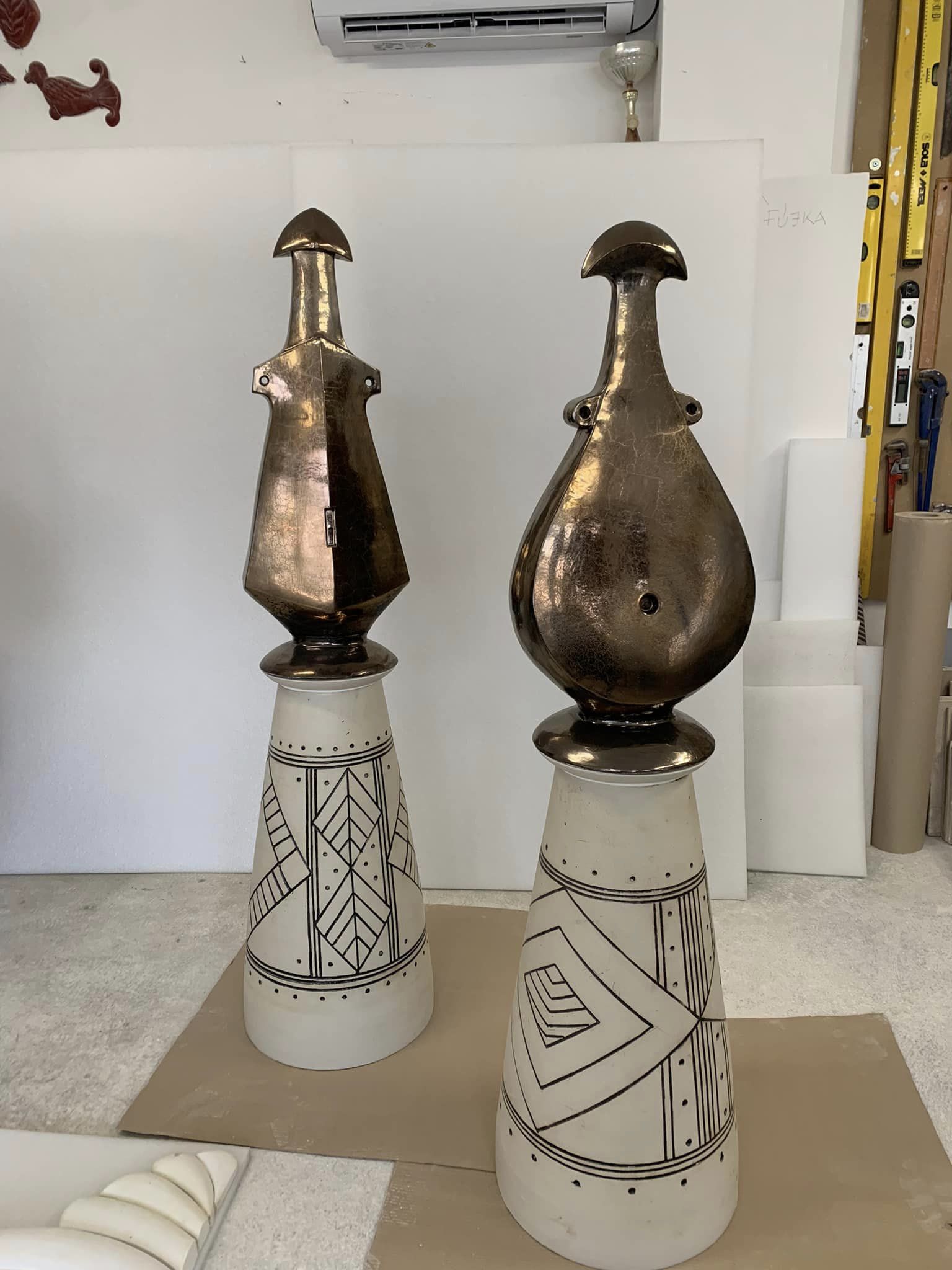 Nagy Nándor hódmezővásárhelyi restaurátor, képzőművész tervezett és készített a Kurca-parti sétányra. A kültéri elemek, sziklák mellett jelenik majd meg ez a női es férfi alakot ábrázoló plasztika.A Szentes környékén feltárt legrégebbi emlékek, ősmaradványok, a férfi és a női istenség megjelenítése volt az alapkoncepció, a kiindulási pont, mindez 21. századi megfogalmazásban. Az alkotások ipari porcelánboltban készültek.