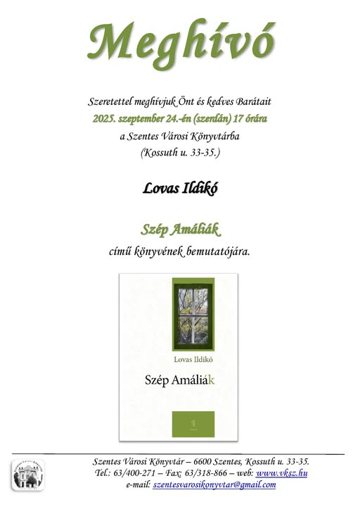 Holnap 17 órakor a könyvtárban Lovas Ildikó író, műfordító, szerkesztő Szép Amáliák című könyvének bemutatóját tartják.