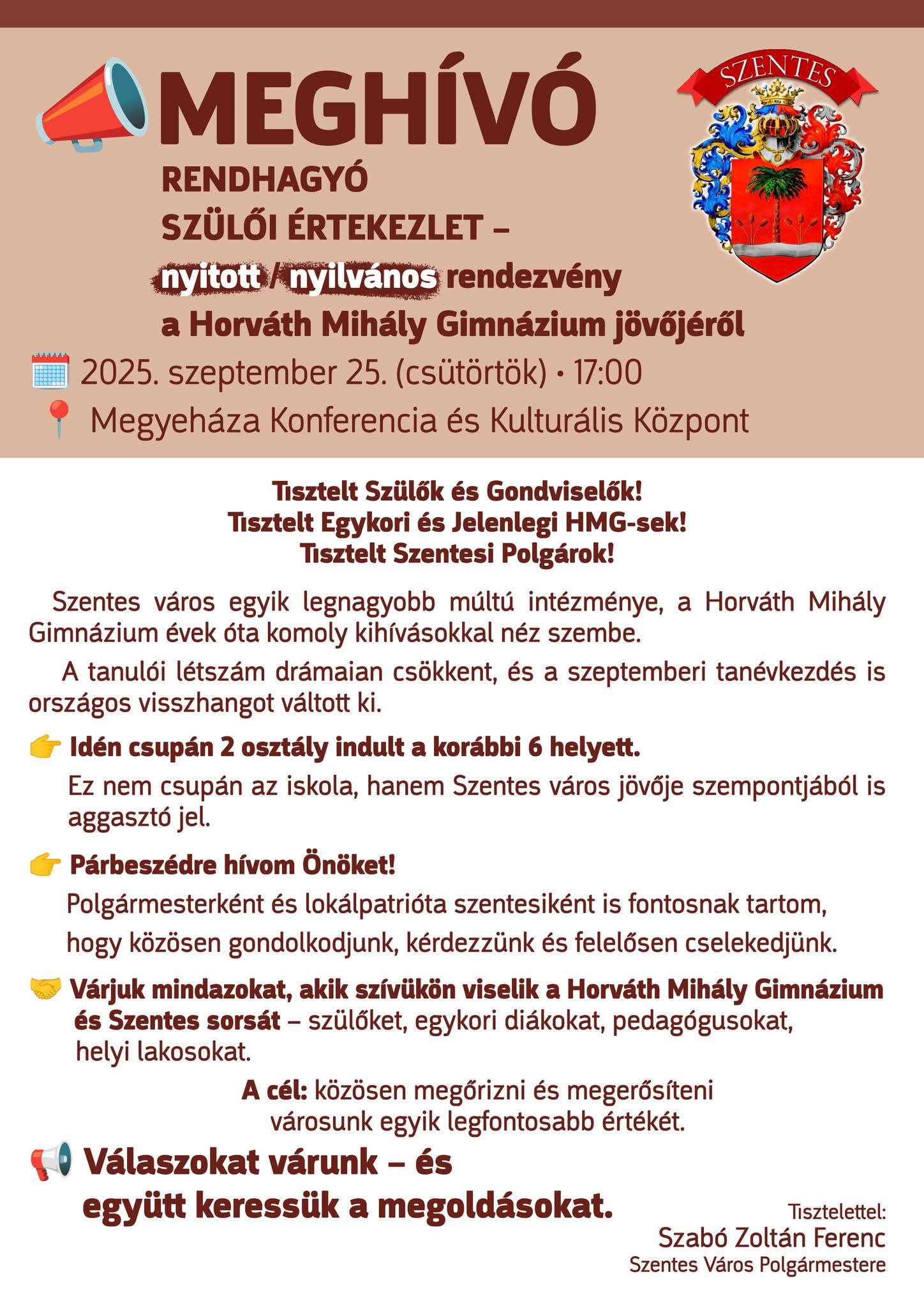 Rendhagyó szülői értekezletre, párbeszédre hívta a nagy múltú Horváth Mihály Gimnázium és a drámai tagozat jövőjéért aggódókat, valamint az iskola és a fenntartó képviselőit Szabó Zoltán Ferenc polgármester az aHang szentesi szervezetével. A megyeházán tartott nyílt eseményen azonban igazi párbeszédre nem került sor. Bővebben hamarosan.