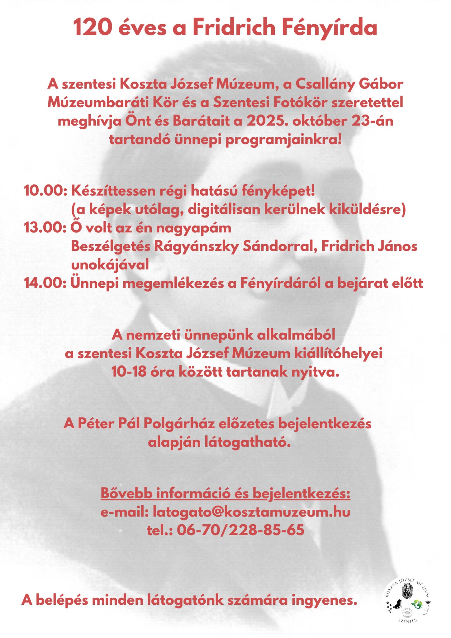 A Fridrich fényírda 120 évvel ezelőtt, 1905-ben nyitotta meg kapuit Szentesen. Az eltelt több mint egy évszázad során a műterem nemcsak a város, hanem a térség vizuális emlékezetének is meghatározó létesítménye lett. Ennek alkalmából 2025. október 23-án ünnepi programokkal várják a látogatókat: