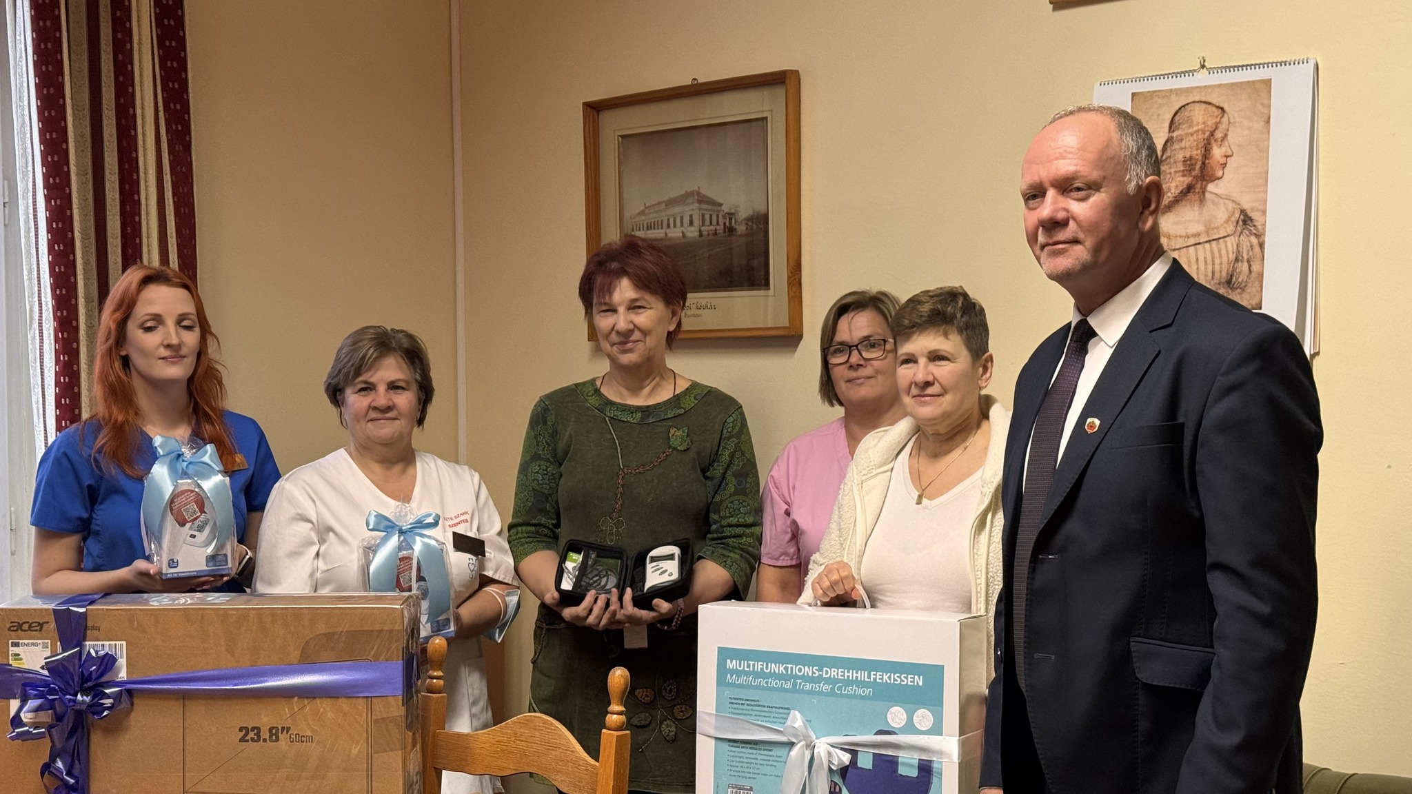 A szentesi kórház három osztályának, a gyerekosztálynak, vérellátónak és az onkológiának adott át az önkormányzat nevében ajándékokat Szabó Zoltán Ferenc polgármester, akit dr. Tóth Edit főorvos asszony fogadott december 22-én.