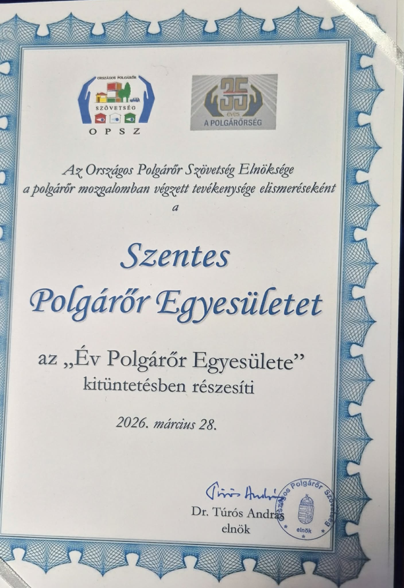 Több száz polgárőr részvételével ünnepelte megalakulásának harmincötödik évfordulóját az Országos Polgárőr Szövetség. A március 28-i, a Bálna Honvédelmi Központban megtartott rendezvényen az Országos Polgárőr Szövetség által adományozható elismerések között átadták az Év Polgárőr Egyesülete kitüntető címet, amelyet azok az egyesületek kaphatnak meg, akik alap- és kiegészítő feladatait a legkiemelkedőbben végzik. Ebben az évben a kitüntetést a Szentes Polgárőr Egyesület kapta meg.
